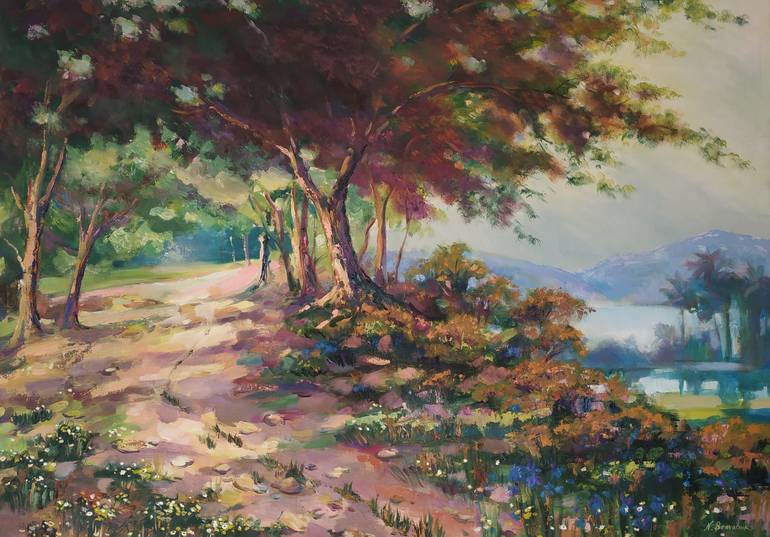 The bright summer landscape filled with sunlight and unusual shades of trees and flowers. The picture is filled with positive energy and has a relaxing effect on the mind and the soul. Oli on Canvas. Size: 70X100 cm.