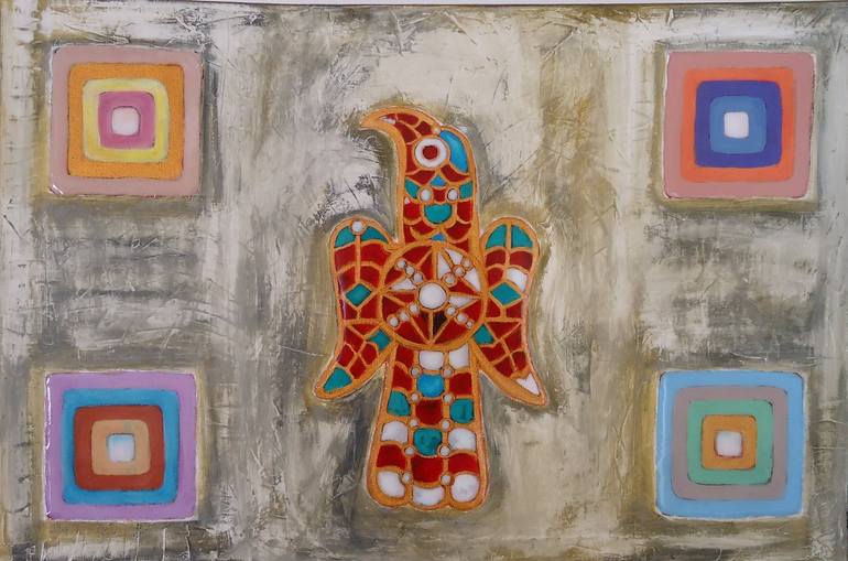 I love everything that connects me to ancient mysteries and secrets. Like this bird in the center. It is inspired by an ancient Spanish brooch. The background mimics an old wall, and all drawings are covered with liquid glass, epoxy resin. And all this reflects a deceptive light.