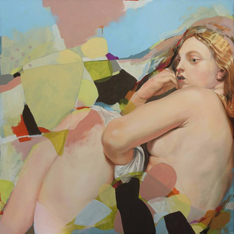Anja Wülfing, based in Cologne, Germany, is an artist whose work revolves around the exploration of contrasts and oppositions. Her creative drive stems from the duality within her artistic vision: one side deeply rooted in the traditional aesthetics of Baroque, Rococo, and Neoclassicism, and the other drawn to the freedom of abstraction. Wülfing’s art seamlessly blends these opposing forces, where figuration meets abstraction, and tradition intertwines with modernity. She achieves this through her unique approach to materials and techniques, stitching together fine and coarse canvas and using a mix of media. Classic elements are rendered in oil, while abstract components are brought to life with acrylics, pencils, and markers. This fusion of different textures and methods creates a harmonious unity out of seemingly disparate elements. In her compositions, Wülfing plays with contrasts such as light and dark, dynamic and static, strict and playful, crowded and empty. Yet, she carefully balances these opposing forces, ensuring that neither dominates but rather enhances the other. The styles may seem to compete for attention, but in the end, they coexist in a mutually enriching dialogue. Her painting process is precise and methodical, drawing on the familiar, the time-honored, and the matured. The figures are meticulously painted in oil, while the abstract elements, added in acrylics, pencils, and markers, bring a modern energy. Through this blend of classical technique and contemporary expression, Wülfing creates distinct “frequencies” of emotion and mood, shaped by the interplay of form and color.