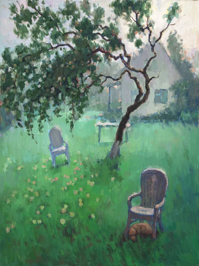 Oil painting with a Latvian typical landscape with a private territory of summer cottages, with a cosy apple trees. The whole family is hidden at home from the rain. But one dog still remained outside in the garden, enjoying the pleasant freshness and coolness of the summer rain. Nothing disturbs hi...
