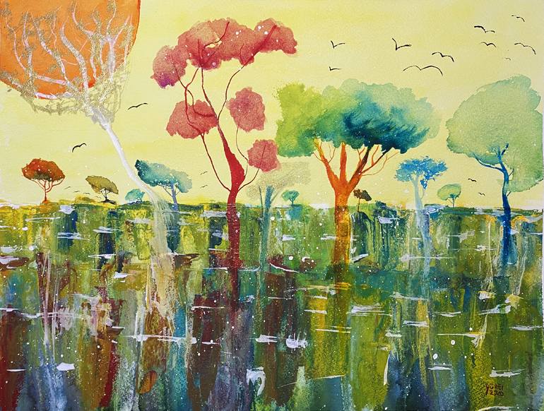 Original Semiabstract Watercolor on fine art paper Arches 300 g /m2, grain torching rough, cold pressed, 100% cotton. Format 30x40 cm (A3). Pigments Daniel Smith and Schmincke. The original of the painting was sold. It is ideal for decorating a child's room.