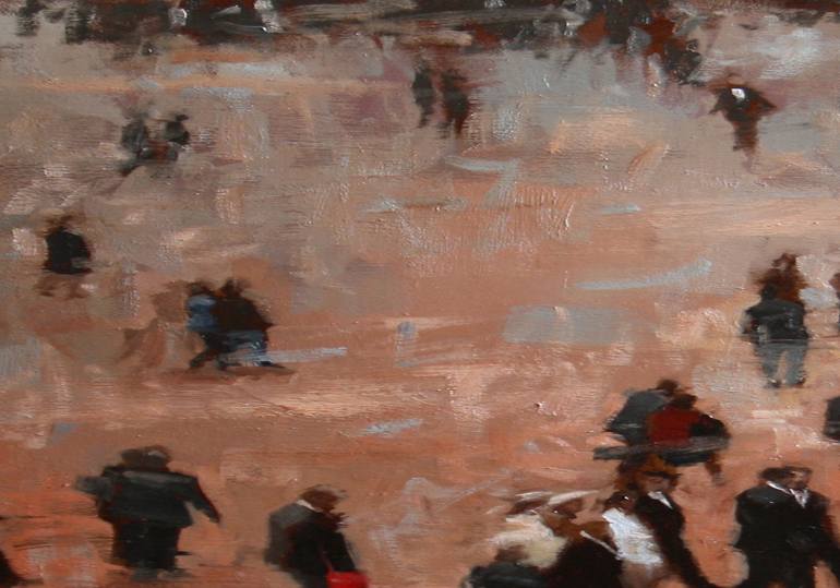 This is a painting inspired by the sight of a large gathering of people, viewed from an elevated position. The people are viewed against a warm coloured gravel ground, which affords a uniformity to the nature of the shapes formed by the people against the negative space of the background. The paint...