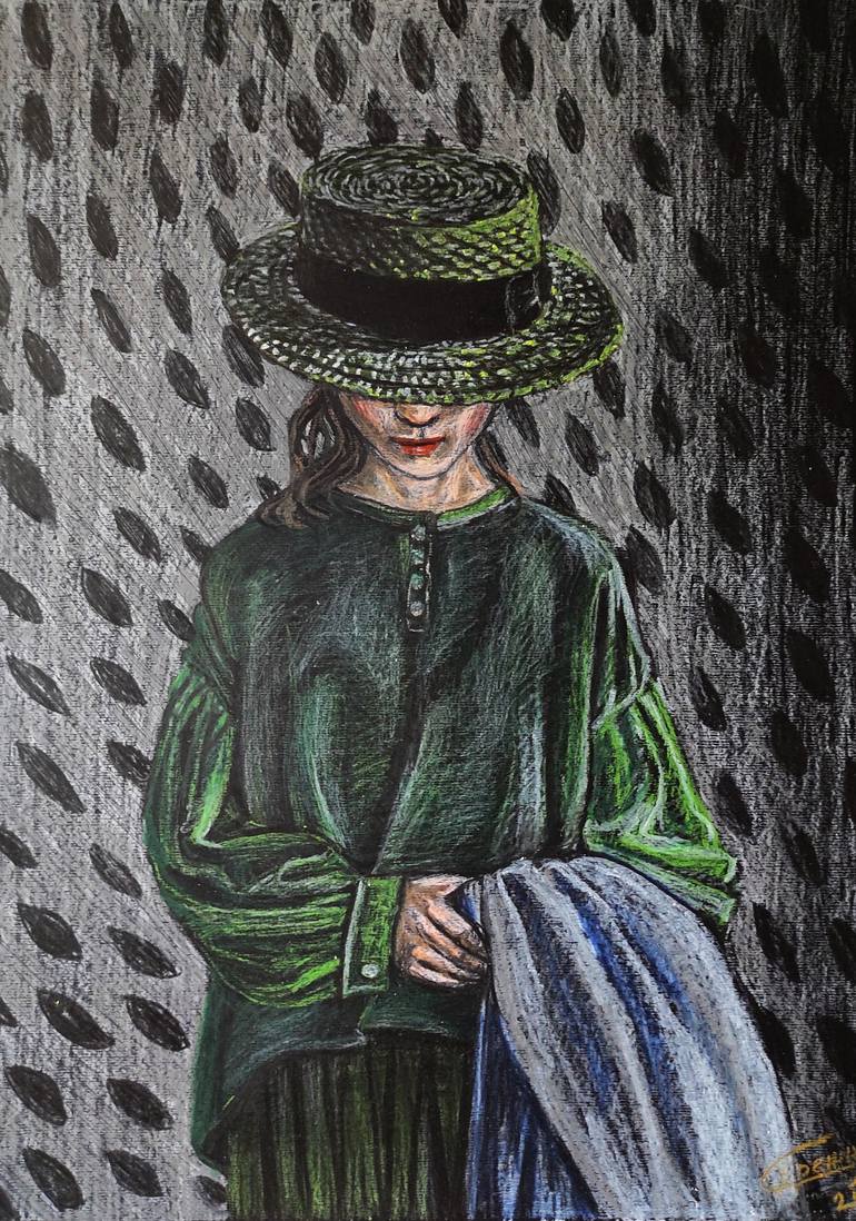 The painting is made with wax crayons on cotton paper. The girl has stopped in a moment. She's sad. Thinking about how and what she should do next.