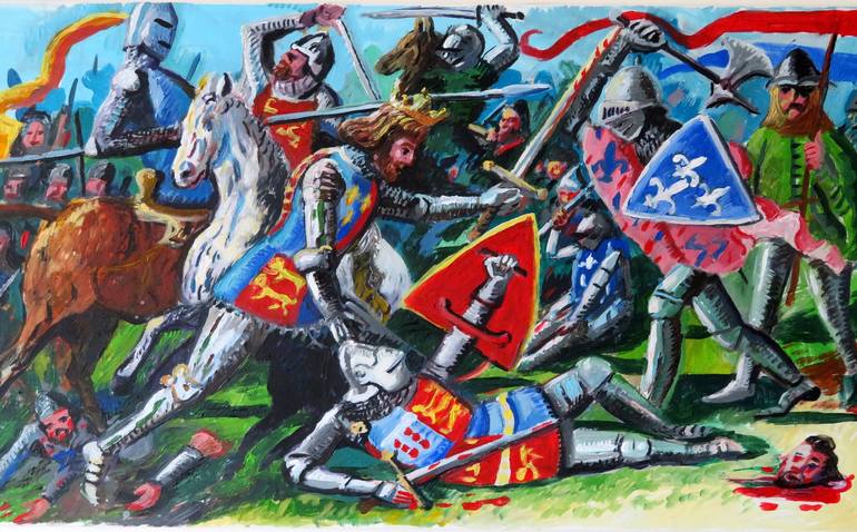 This is a scene from the battle of Agincourt, King Henry v can be seen protecting one of his fallen knights. In this vibrant acrylic tableau, I've captured the valor and turmoil of a monarch amidst the chaos of battle. Employing figurative elements with touches of impressionism and realism, I sough...