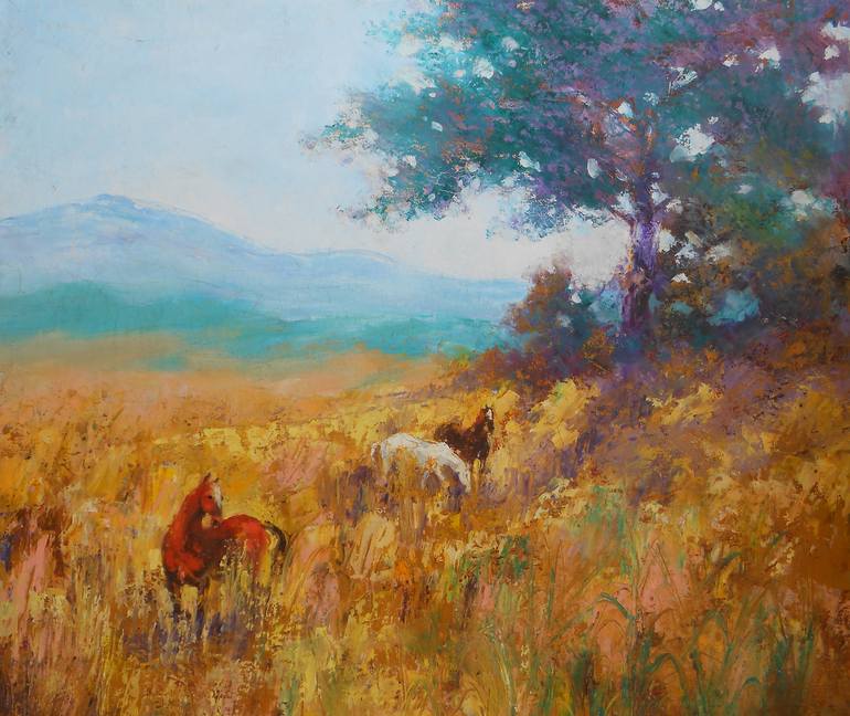 Painting from 2013 with cracked oil colors. (BIG SALE!!!) A hot, sunny day conveyed on the picture by the combination of warm and cool colors: fields dry from the summer sun, turquoise foothills and quietly grazing horses. The harmony of nature and colors in the painting gives peace, relaxation and ...
