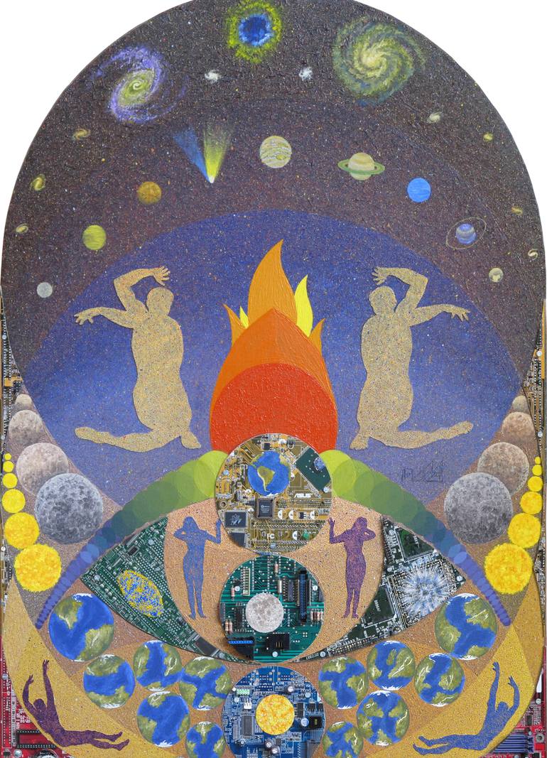 This work makes a comparison by the writings of Giordano Bruno and many discoveries of the science today. It was painted using the classical thechnique of oil painting and the incorporation of some materials created by the actual technology like computer boards. Usually I put in my works many materi...