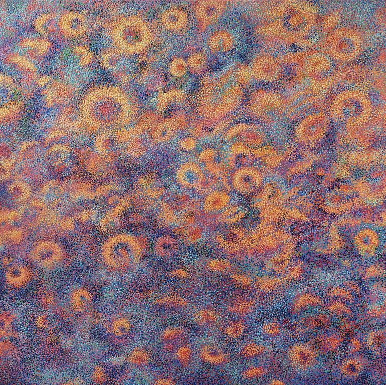Painting size: 80 cm x 80 cm The painting is framed in a white frame and is ready to hang. Total size: 85 x 85 cm. The artwork is made of thousands of superimposed points of less than 2 mm in diameter, individually painted. The painting is signed on the back and has a certificate of authenticity.