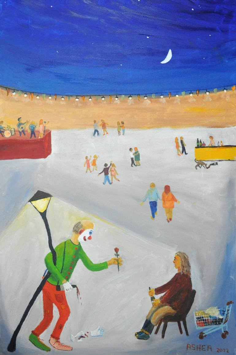 In preparation for an art exhibition on wine, I painted this painting. Under the influence of wine people dance, celebrate and even the clown goes to make a poor woman happy