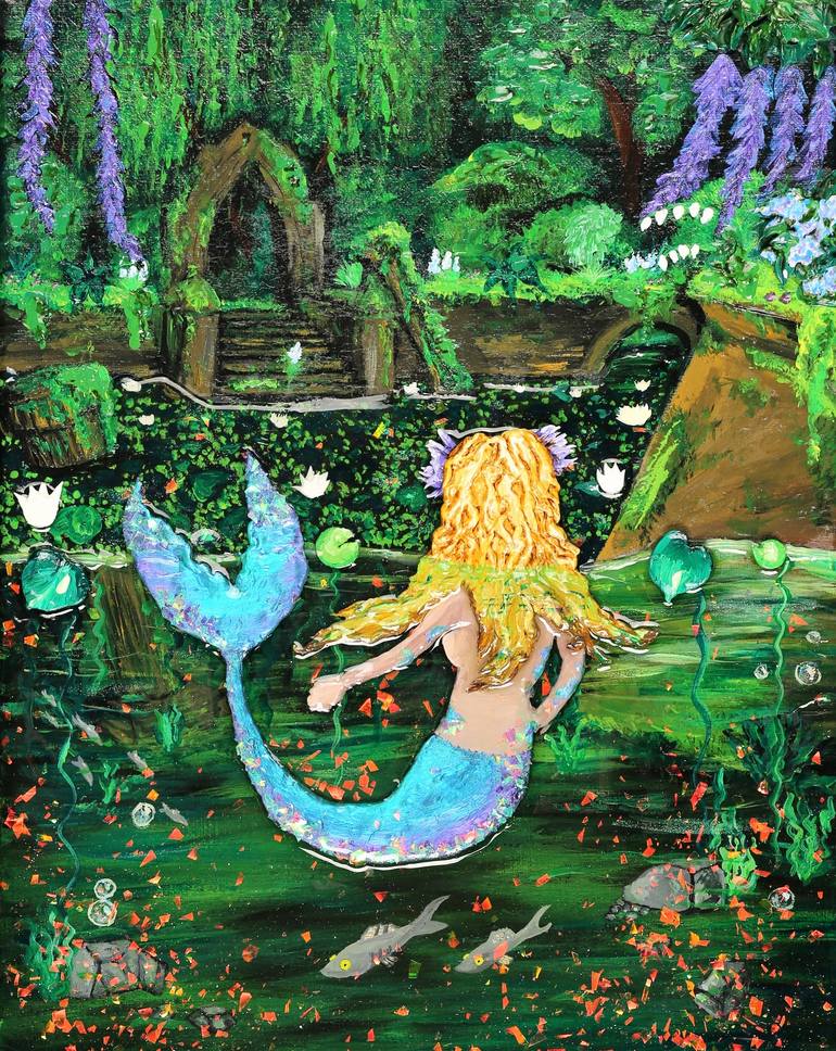 Titled 'The Ancient Guardian of the Ancient Temples, Below the Surface,' this captivating painting is inspired by the game 'The Last Guardian.' It reveals an enchanting world beneath the water's edge, where a sculpted mermaid with yellow curly hair and a green-shifting glitter tail stands in a mysti...