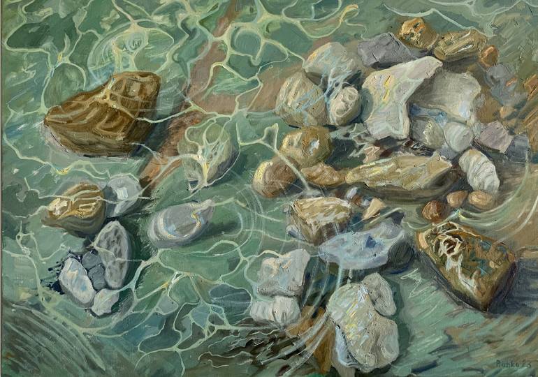 "The lights of a sun" this work conveys the image of a quiet harbor off the coast of the Adriatic Sea, sea stones lie at the bottom and bask in the rays of the sun. the picture is made in calm turquoise shades, the water smoothly flows around the stones, and the play of the rays of the sun on the st...