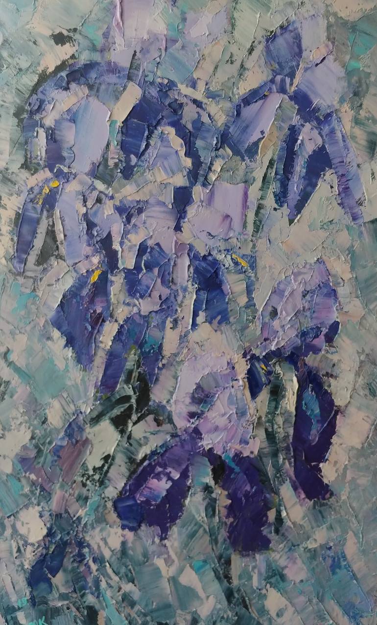 Painting: Oil on Canvas. Original oil painting full of rich and yummy textures by artist Olena Tymoshchuk "The magic of irises" 40 X 25 CM Сardboard, oil Signed on the front and back Dated 2019 I was inspired to write this work by iris flowers. They are light, windy, soaring and bring spring warm...