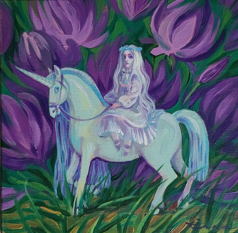 The legend of a maiden and a unicorn is always in my heart. I painted them in a beautifully flower garden. There is a mystery in this art.