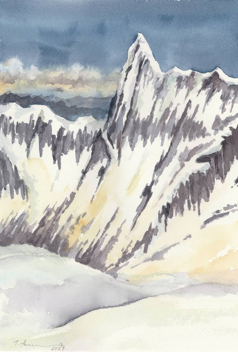 The mountain. Mont Blanc Massif, Alps. Watercolor painting on paper. This painting conveys the emotions and impressions from my trip to France. The world around us inspires for our creativity, you just need to take a closer look. The painting is signed and accompanied by a Certificate of Authentici...