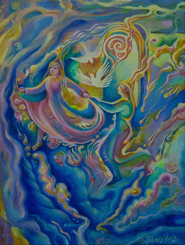 Everything flows, everything changes. The energy of life flows in waves and forms the entrance to the future. Couple in love move through life in a dance. The painting is made in rainbow colors, it is a symbol of the couple's limitless possibilities