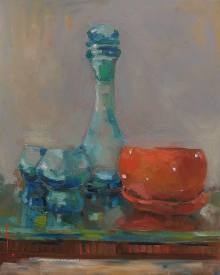 Objects on a glass table. So many times the things that are around us become important for the moment, others we keep for future generations. At this moment the orange vase is passed on and now, for sure, it shelters some flowers somewhere. Oil on canvas.