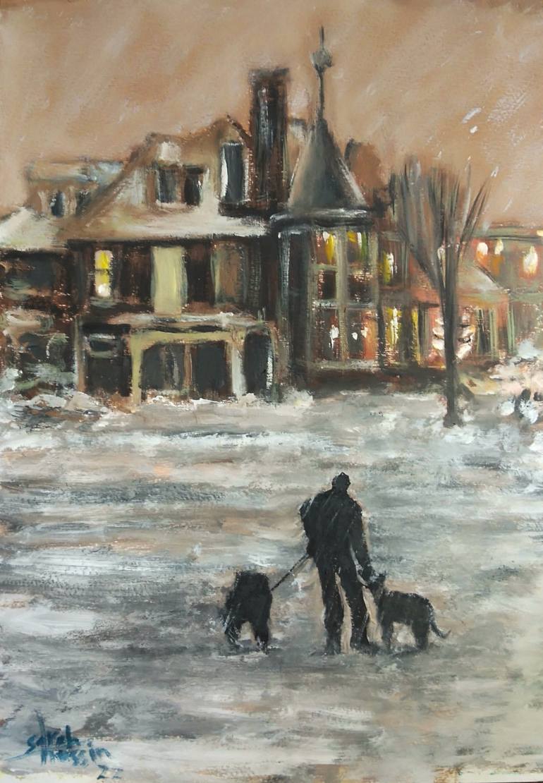It's a painting of a palace at the end of the road, and a man with a dog walking in a snowy day.