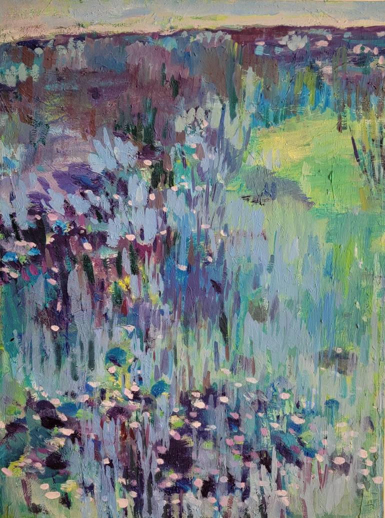 This 24x18 inch oil painting explores an inner landscape imbued with soft romantic lyricism. The artist discovered that a 'path of flowers' naturally emerged within the composition, guided by the spontaneous flow of color rather than a planned setting. The deep, gentle tones of purple and blue chara...