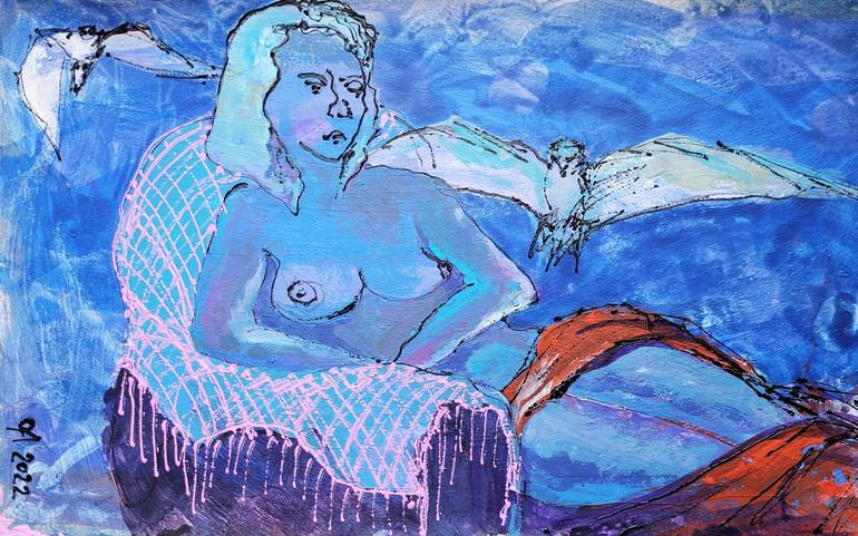 A naked woman, in an armchair, on an indefinite blue background. What could she tell us? Is she waiting for her lover, or has he just left? Does she expose herself to an enchanting spectator, or does she remain alone in her world? These white birds could be Confidence and Doubt. But which is approac...