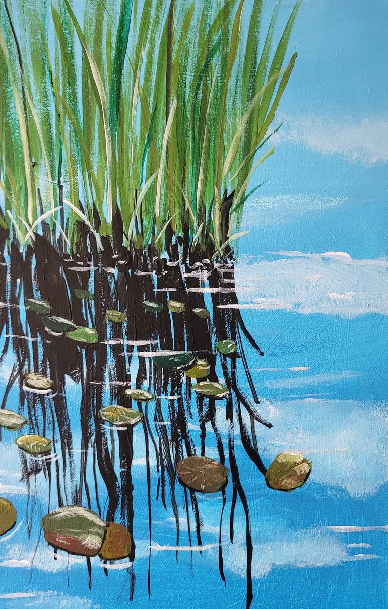This is a painting I’ve done of a pond with some grasses growing out of it. A simple setting, but a strong image, with all its bright and dark contrasting colours. The painting is done with premium acrylics on prepared hardboard. With these materials, all the vibrant colours and brushstrokes come o...