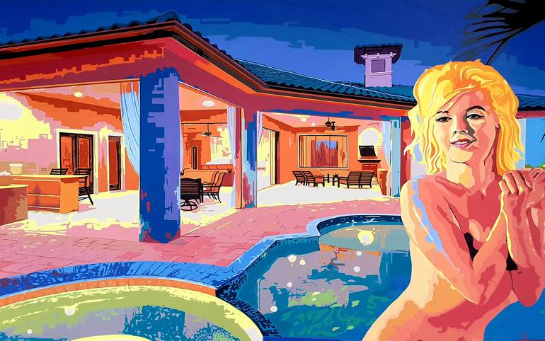 I was challenged by an San Diego artist (she owned a work of me) to make a painting of a house. Now I do like to do portraits more so I did a mix and made use of the swimming pool to add a celebrity. This work took a a long time to do as it involved a lot of detailing and measuring. It was all draw...
