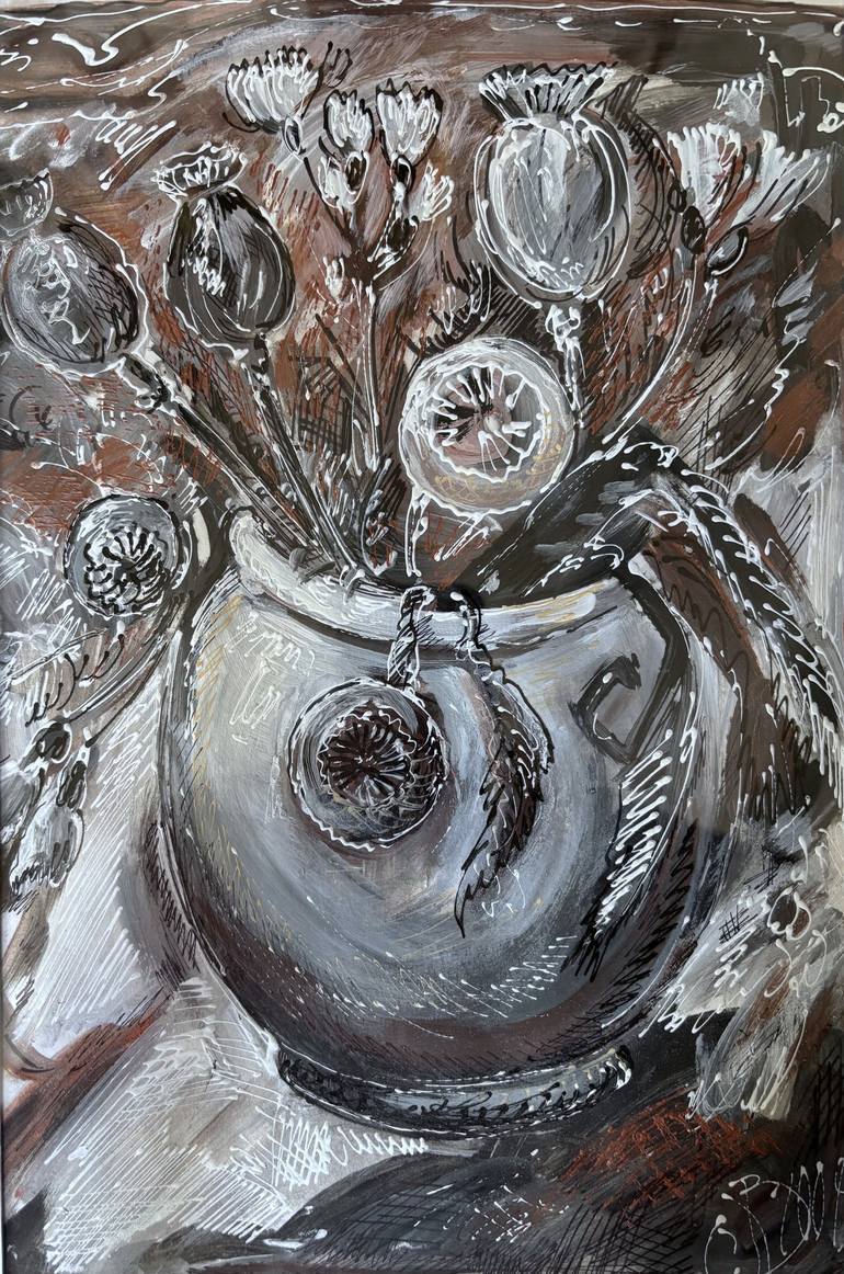 This painting appears to be a still life featuring dried poppy flowers in a rustic vase, rendered in a monochromatic, expressive style with elements of abstraction. The contrast between dark and light tones, along with dynamic brushwork and textured details, gives it a sense of depth and movement. T...