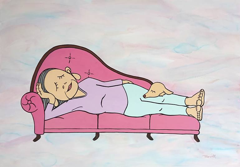 A reclining Buddha is an image that represents Buddha lying down and is a major iconographic theme in Buddhist art. He is lying on his right side, his head resting on a cushion or relying on his right elbow, supporting his head with his hand. In modern time, an old lady is reclining on a sofa with...