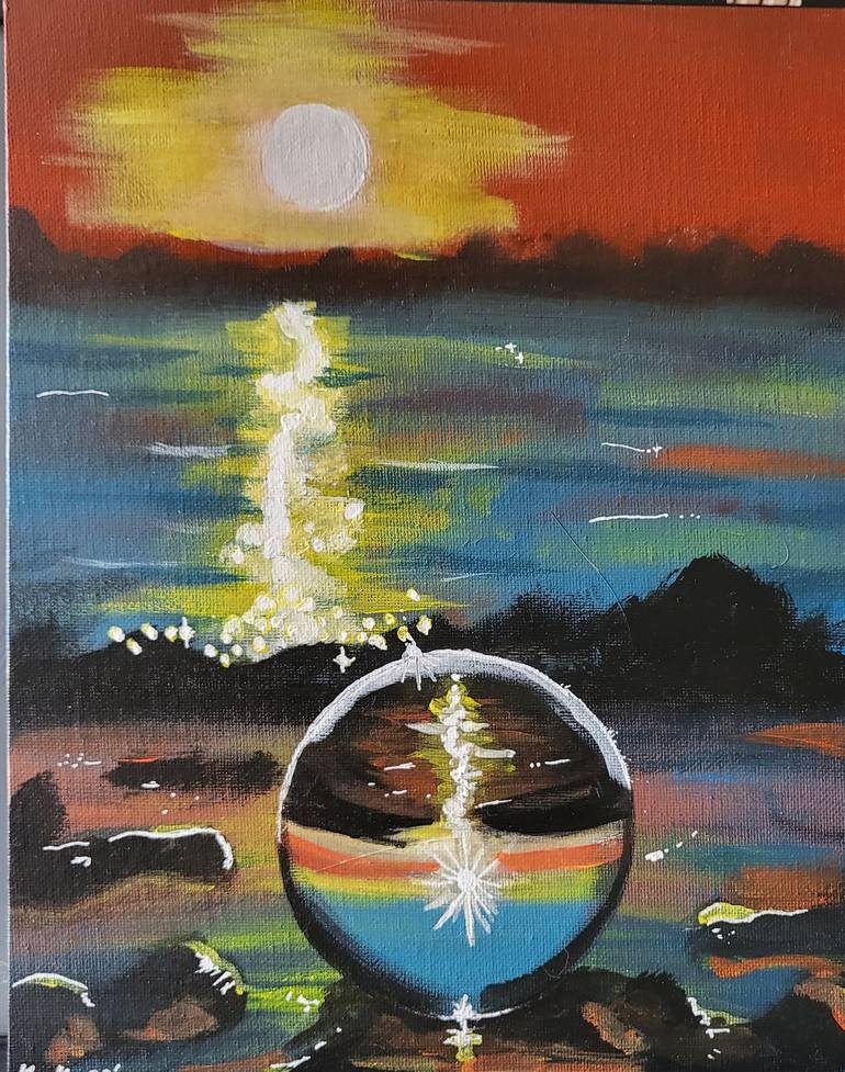 This is a simple painting of a glass sphere on a beach, reflecting all the colours of its surroundings. The painting is done with premium acrylic paints, on a prepared wooden panel. With these materials all the radiant colours an brushstrokes come to their rights. The piece is shipped without a ...