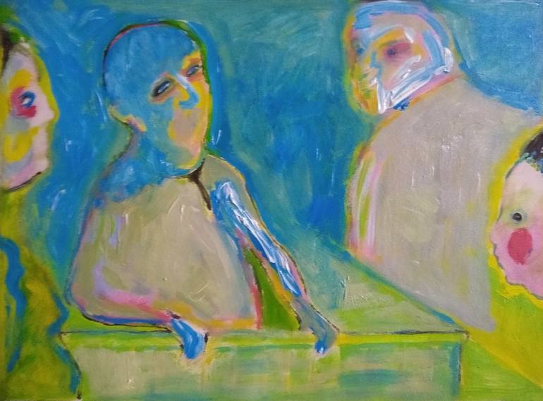 Painted on poliester fabric in dominating blue color shows a trial scene