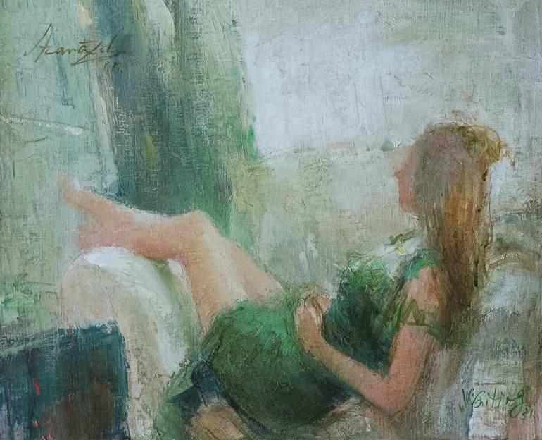 "The Waiting" captures the essence of anticipation and patience through the portrayal of a woman in a moment of quiet expectancy.