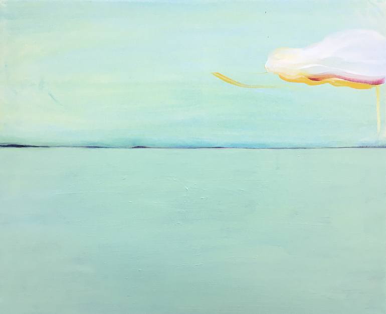 One day we had a day when the sky was the same colour as the sea, I remembered it and as I found the love for the light green color, I knew I had to paint a whole painting with it. The cloud came by it self in a easy one movement and stands interesting against the well painted painting.