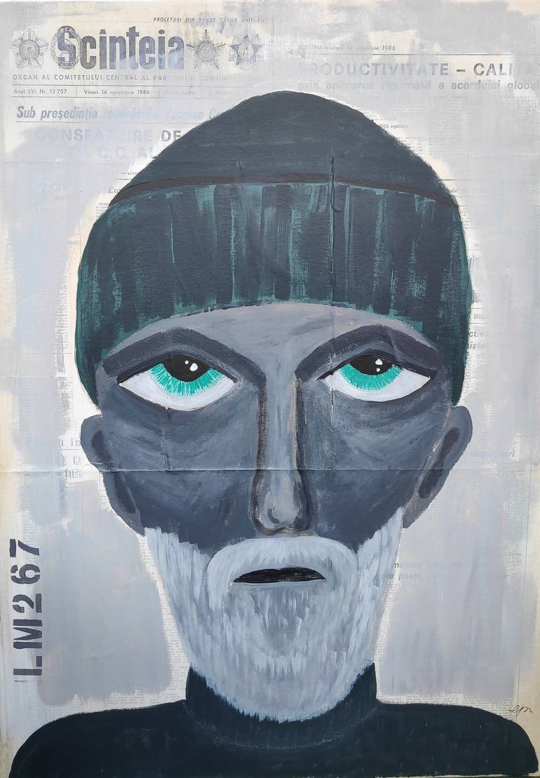 This imaginary portrait was inspired by my fascination with the immense power of expression that a face has. Without saying a word, a face can tell a whole story. My figurative paintings try to tell different stories, told by different faces... This painting is made on old newspaper clippings glued...