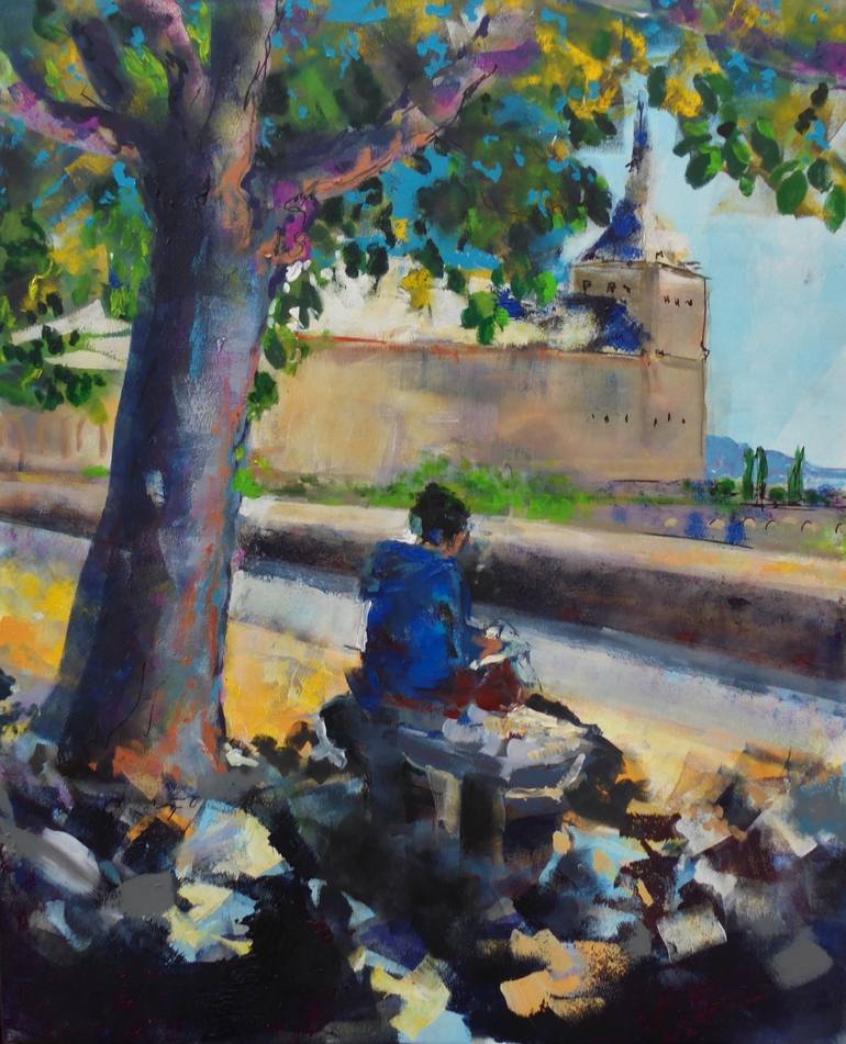Between the sky and the floor, under a protective tree a person is writing absorted in her toughts