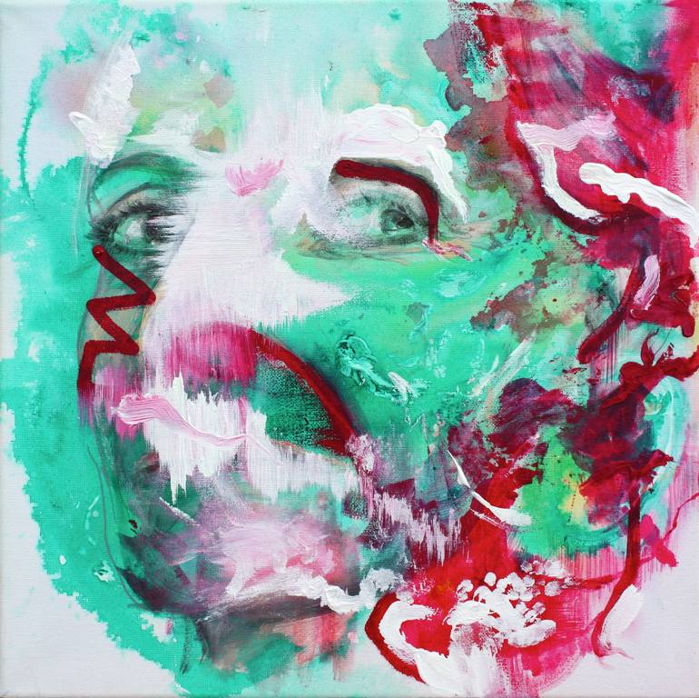 A portrait, stained with abstractions in red and white. It is painted on the sides and signed on the back, ready to hang.