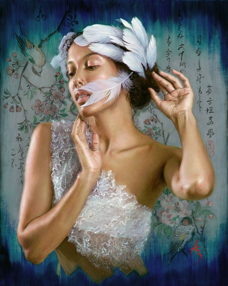 My painting captures the ethereal metamorphosis of the soul. The delicate feathers, both adornment and veil, symbolize liberation through transformation, while the bird motifs echo the yearning for transcendence. The cherry blossoms hint at fleeting beauty and impermanence, grounding the spiritual a...