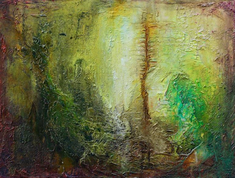 This piece was created using several acrylic paint and texture mediums to create depth.