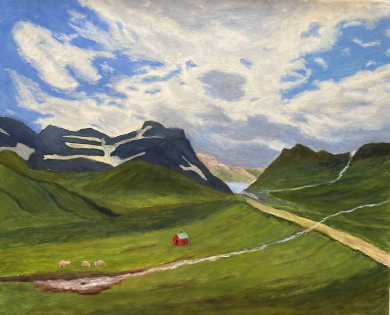 I was inspired by a trip to Iceland. This painting captures much of the Icelandic landscape — volcanoes, melting icecaps, streams, a small fishing village in a cove, ubiquitous sheep, crofts, and a big sky. It’s almost like being there!