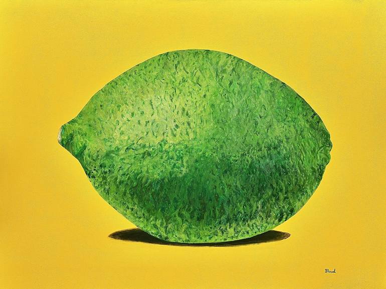 A vibrant green lime is set against a bright yellow background, creating a striking contrast with a subtle shadow underneath. The detailed texture of the lime gives a sense of realism and depth. The simplicity and bold colors create a striking visual contrast. This is one of two paintings that are m...