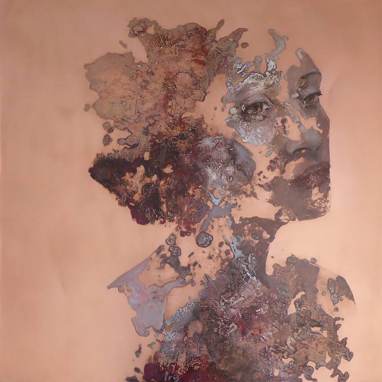 The essence of her work For Iris, every painting begins with a quest. Each piece must hold something unique — a feeling that stands apart from the very first moment. She often starts over, even after working on a painting for weeks. “Through trial and error, I’ve learned not to keep adjusting once the feeling is gone. Yet those are always difficult moments — that breaking point when a painting risks losing its soul.” Her aim is both simple and demanding: every work must be her best. She works slowly and with full concentration, without sketches or test pieces; each painting is the experiment. This makes her less productive, but every piece becomes a unique result of a process that can only unfold in her studio. Perfect imperfections Iris follows no trends or movements. Her work grows from a personal exploration of emotion, material, and layering. The structure of her elegant female figures lies hidden within layers of stains and textures. These “perfect imperfections” form the foundation of her portraits and emphasize the beauty of humanity — unique, fragile, and extraordinary. For Iris, a work is only complete when abstract and realistic forms connect and enhance one another. ________________________________________ Materials and rust Iris carefully selects only the finest materials: pigments, inks, (precious) metals, and aluminum panels. She experiments with metal particles and acids, triggering oxidation processes such as rust. Each material requires its own approach and fuels her ongoing artistic evolution. She also creates her own medium and reuses old paint residues to build new textures. Each work thus literally carries the layers of its creation within itself. ________________________________________ About Iris Raised in the forested village of Groesbeek, Iris discovered her fascination with form, color, and material at an early age. Influenced by her deaf father, with whom she often undertook building projects, she developed a keen eye for detail and craftsmanship. After Art School in ’s-Hertogenbosch, she spent several years working in the corporate world, but since 2007 she has devoted herself entirely to her art. Driven by constant curiosity, she continues to seek new ways to refine and deepen her work. “Open your eyes and dream.” Her paintings are part of various private collections in the Netherlands and abroad.