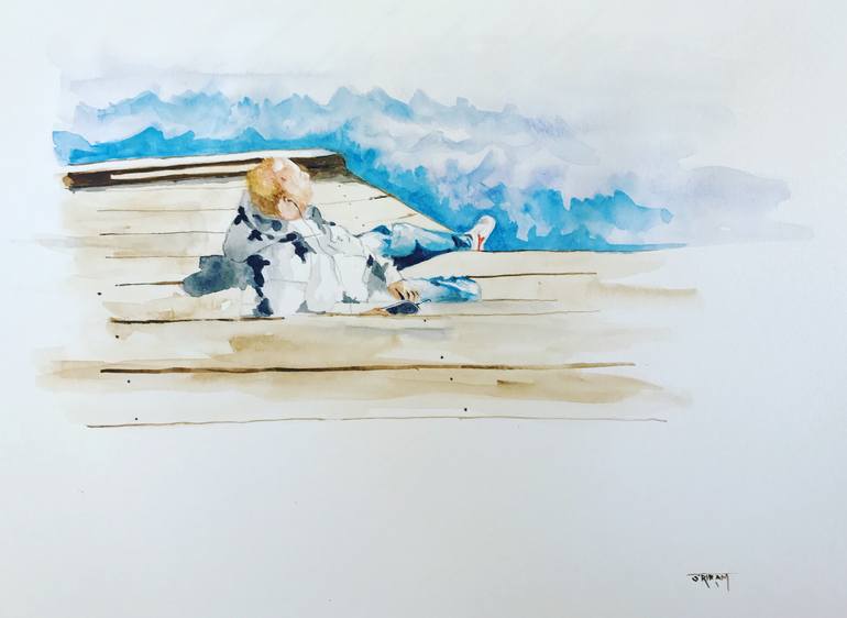 On a sunny day alongvthe fjord he sat there with music under the blue sky. Thoughts or free of thoughts? I did this on a Canson hot press 140 lbs with Winsor and Newton watercolors.