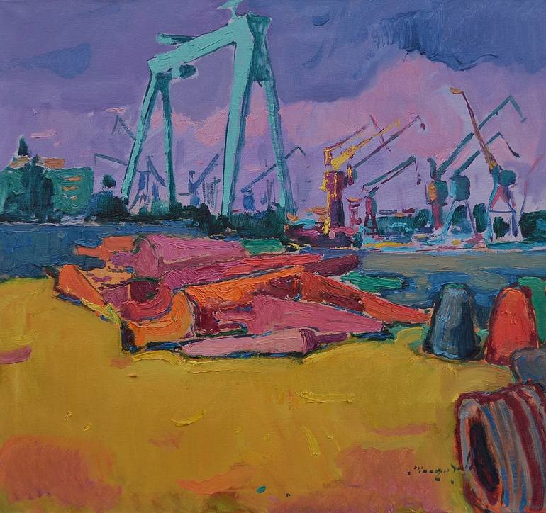 A vibrant scene shows a shipyard with large cranes, featuring bold and contrasting colors. The foreground is composed of various abstract shapes in red and orange, set against a yellow ground.
