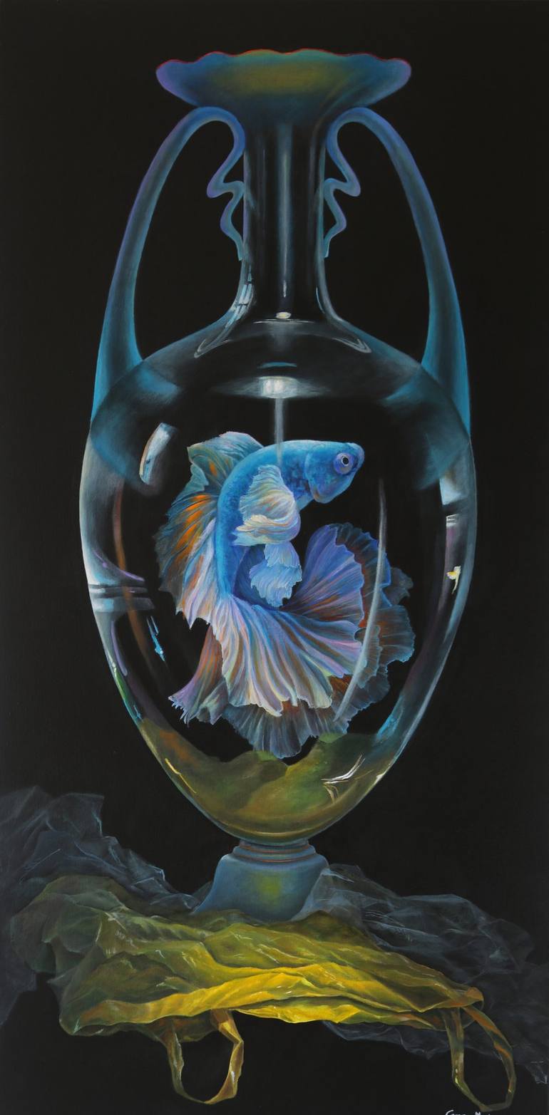 Born in La Paz Bolivia. My work has constantly focused on interpreting nature, the continuous cycle of life and death, creation, the wonder of the universe, and lately, my disappointment caused by the destruction that our planet is suffering. Nature has been a recurring theme in my work for many years. I have included bottles and glass containers in the series of paintings I am currently working on because of their fragility and beauty. In this way, fragile glass containers acquire two meanings: the vessel floats in infinite space as our planet in the universe, and the second, they become tiny universes, wombs harboring life, seeds, fish, eggs, or plants. The fragility of our planet is reflected in the infinity and the fragility of the life that develops in it, and I call for its preservation and conservation. These vessels float in space, sometimes on ephemeral elements like dried fabrics or sheets. My palette of colors is varied; I work with high-contrast colors inspired by the beauty of nature and also to create more expressive force.