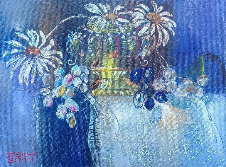 Title: Three Daisies Size: 40 x 30 cm Medium: Oil on canvas Description: Three Daisies is a vibrant and richly textured still life that blends classical charm with a modern twist. At the center of the composition are three delicately wilted yet expressive daisies, their white petals gracefully arch...