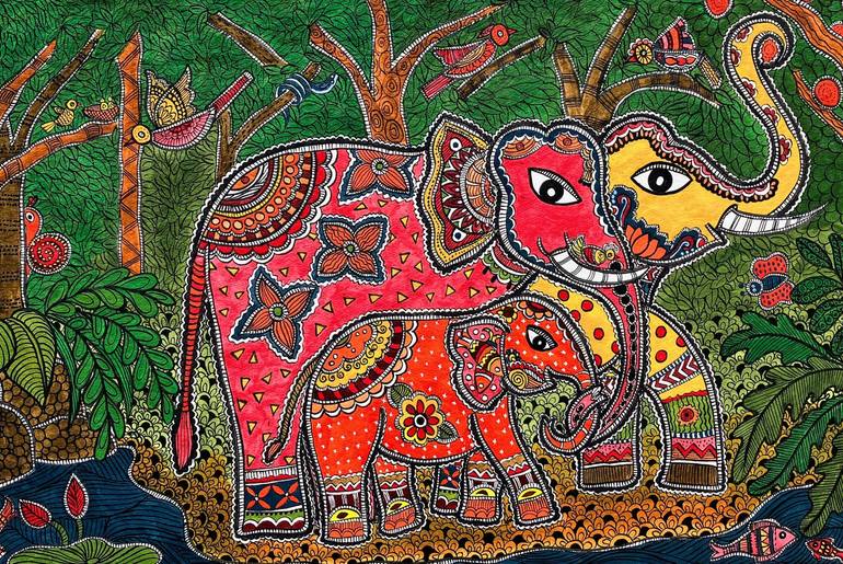 Immerse yourself in the mesmerizing world of Madhubani art with our stunning painting depicting three elephants in a lush jungle oasis. This exquisite piece captures the essence of nature's beauty as it showcases a loving family of three majestic elephants, traversing a lush jungle near a serene riv...