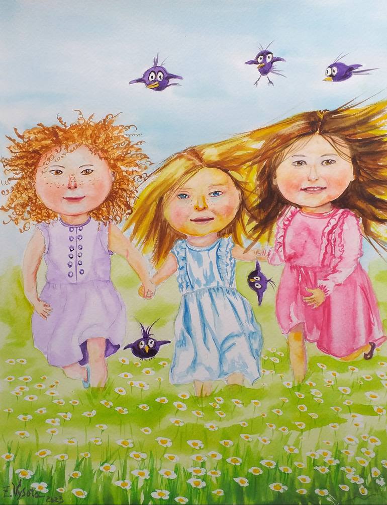 --- Three girlfriends. A warm sunny day, the birds sing beautifully, the mood is in a good mood, I want to run along and enjoy the surrounding harmony. --- This unique and exclusive watercolor painting, hand painted on 300gsm 100% cotton watercolor paper. --- Wonderful idea to deco...