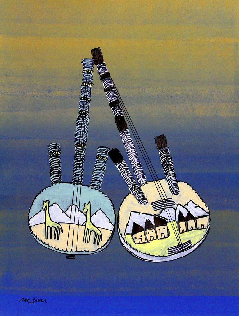 TITLE: Three-Stringed Instruments By ArtGuru 9479A - Acrylic On Paper 100% HAND-DRAWN ORIGINAL SIZE: 3x4' MEDIUM: LatroArt CONDITION: Brand New / Excellent. Comes rolled in a tube. Signed Front and back with certificate of authenticity provided. ABOUT THE DRAWING: This piece depicts two three str...