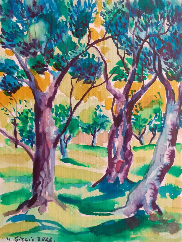 Colourful watercolour depicting olive trees in orchard with yellow background. Wet washes are combined with dry tactile application of colour for the unique and fun image. It is dispatched unframed with certificate of authenticity. In context images are for display purposes. Please check the import ...