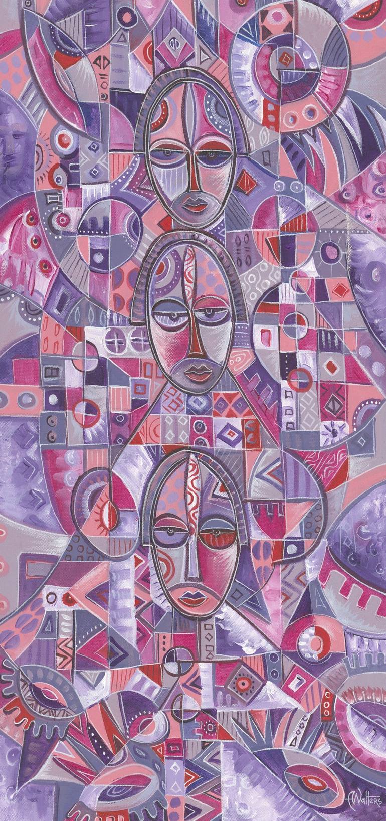 Here is an abstract figurative acrylic painting of three women together in Central Africa by Cameroon artist Angu Walters.
