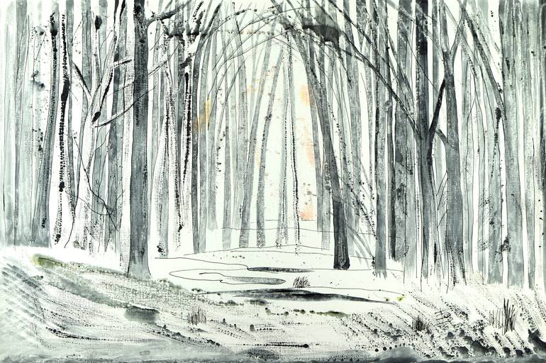 Winter frosty morning in the forest. Yesterday, when the sun warmed, the snow melted a little, so in some places the old grass peeps through ... In the distance, pale sunshine penetrates easily through the haze of fog ... Technique monotype. Paper. Acrylic contour. Water color.