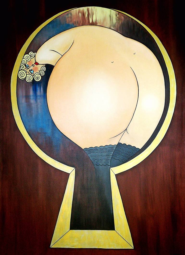 Through the Keyhole: A Portal to Curiosity Naive Oil Painting. 150x110cm, oil on linen. Through the Keyhole is a world of curiosity, wonder, and humor, a naive oil painting that captures the essence of introspection. Inspired by the symbolic nature of the keyhole, this work is a portal to hidden sec...