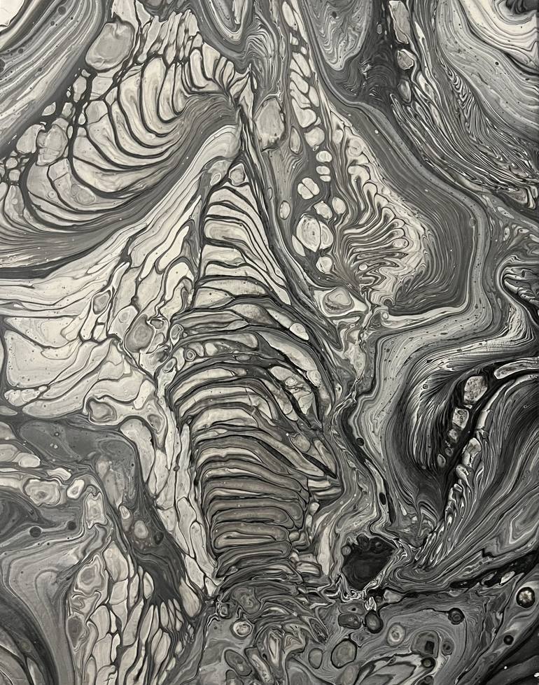 The painting ‘Through the water’ is acrylic on a canvas. Fluid art technique. Black and white.